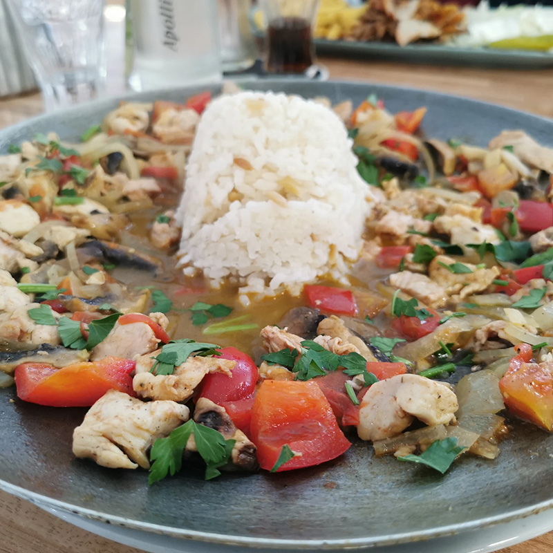 Hähnchenfleischteller aus Hähnchenfleisch vom Drehspieß mit Salat, Tzatziki und Reis oder Pommes